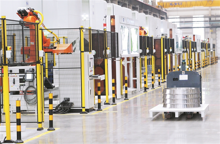以科技创新引领产业升级,以深化改革激发内生动力。凭借创新,洛阳轴承集团股份有限公司相继突破一系列“卡脖子”技术难题,高端轴承产值占企业总产值比重达70%,人均劳动效率显著提高。图为洛轴智能工厂内自动引导运输车在5G网络调度下配送物料的场景。洛阳轴承集团股份有限公司 供图