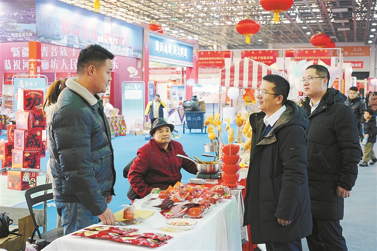 “早上准备了20只烧鸡、50根素肠、100根肉肠,现在只剩一半了,下午闭馆前肯定能卖完。”在以地方美食为主的“舌尖年味区”,熟食经营者郭师傅说,参加年货节不仅是做“眼前生意”,更重要的是树立口碑、扩大影响、吸引回头客,“让更多人记住我们安次区‘南八乡’的年味”。